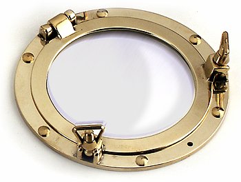 Speigel in einem Bullauge zur maritimen Raumdekoration, Messingausführung.