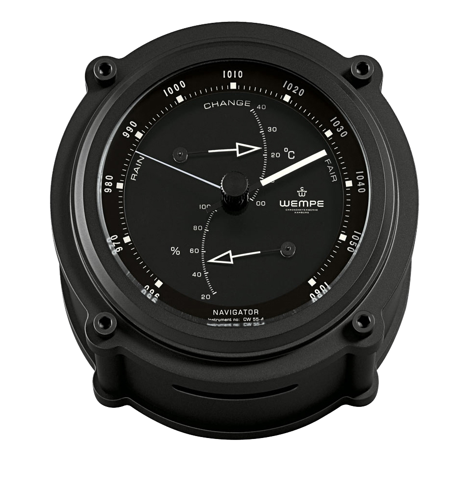 Die Serie WEMPE NAVIGATOR zeichnet sich durch ein modernes, reduziertes und technikorientiertes Design aus, welches es zuvor noch nicht von den WEMPE Chronometerwerken gegeben hat. In Zusammenarbeit mit den Designer Hans Gabriel Schroll wurde ein wahres Highlight geschaffen, das höchsten Ansprüchen an Design und Qualität gerecht wird. Das massive Aluminiumgehäuse mit einem Durchmesser von 130 mm wurde aufwendig perlgestrahlt und matt schwarz eloxiert, was den Instrumenten ein edles Finish verleiht. Die Zifferblattgestaltung lebt von der außergewöhnlichen Farbgebung: Auf die matt schwarze Basis ist ein schwarzer Skalenring aufgesetzt mit weißen Zeigern. Die Markierungen leuchten dank Luminova im Dunkeln nach.