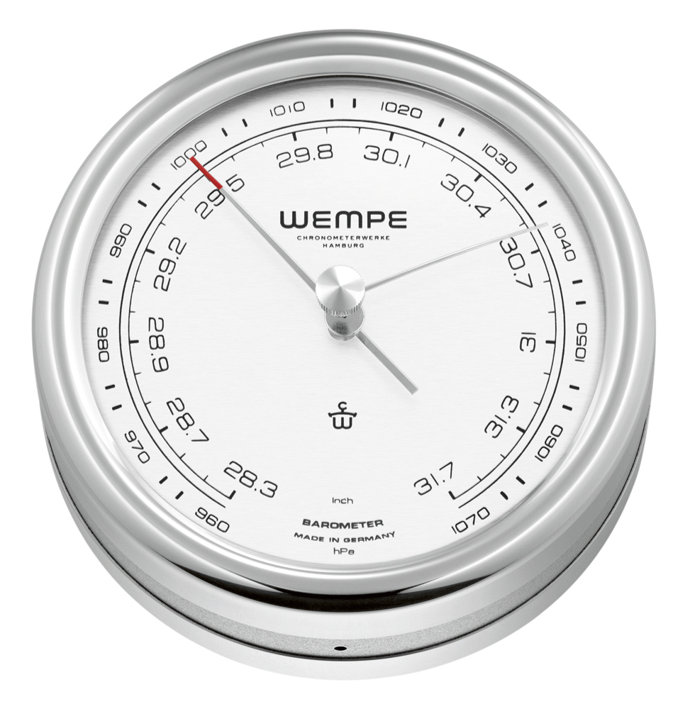 Wempe Barometer im klaren Design, angeleht an das Design von "Fliegeruhren" in einem polierten Edelstahlgehäuse,