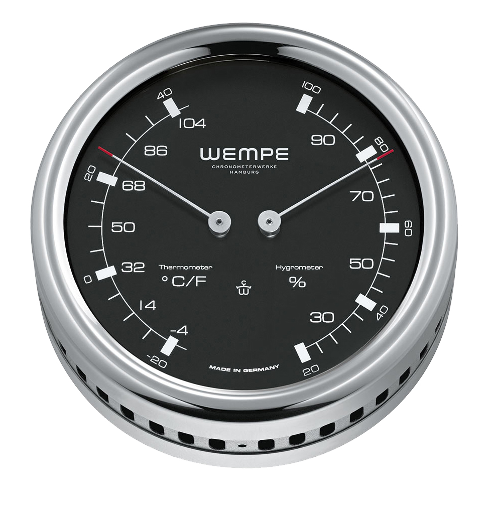 Wempe Hygrometer und Thermometer als Kombinationsinstrument im klaren Design, angeleht an das Design von "Fliegeruhren" in einem polierten Edelstahlgehäuse,