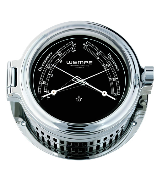 Bullaugen-Comfortmeter bestehend aus Thermo- und Hygrometer, Gehäuse aus massivem Messing, hochglanz verchromt, mattschwarzes Zifferblatt