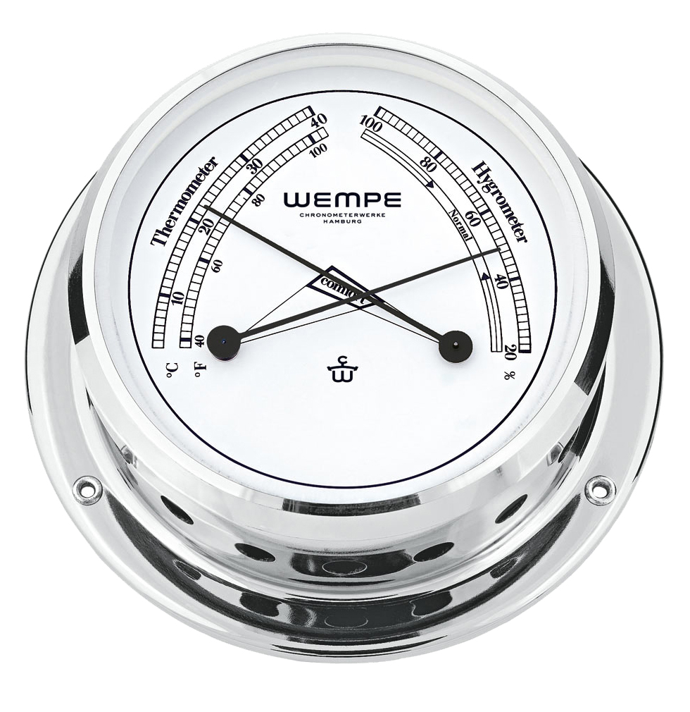 Comfortmeter, bestehend aus Thermo- und Hygrometer, Gehäuse Messing, hochglanz verchromt.