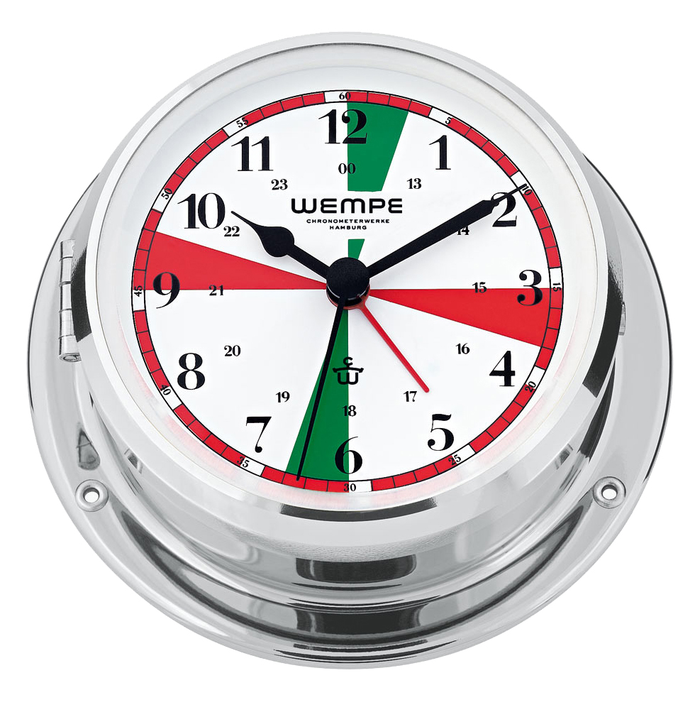 Yachtuhr mit Quartz-Batteriewerk, Gehäuse Messing, hochglanz verchromt. Auf dem Zifferblatt sind die Funksektoren farbig gekennzeichnet, zusätzlich ist diese Uhr mit einem Wecker ausgestattet.