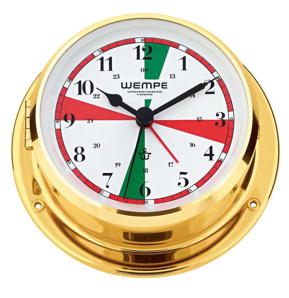 Yachtuhr mit Quartz-Batteriewerk, Gehäuse Messing, hochglanz poliert und farblos lackiert. Auf dem Zifferblatt sind die Funksektoren farbig gekennzeichnet, zusätzlich ist diese Uhr mit einem Wecker ausgestattet.
